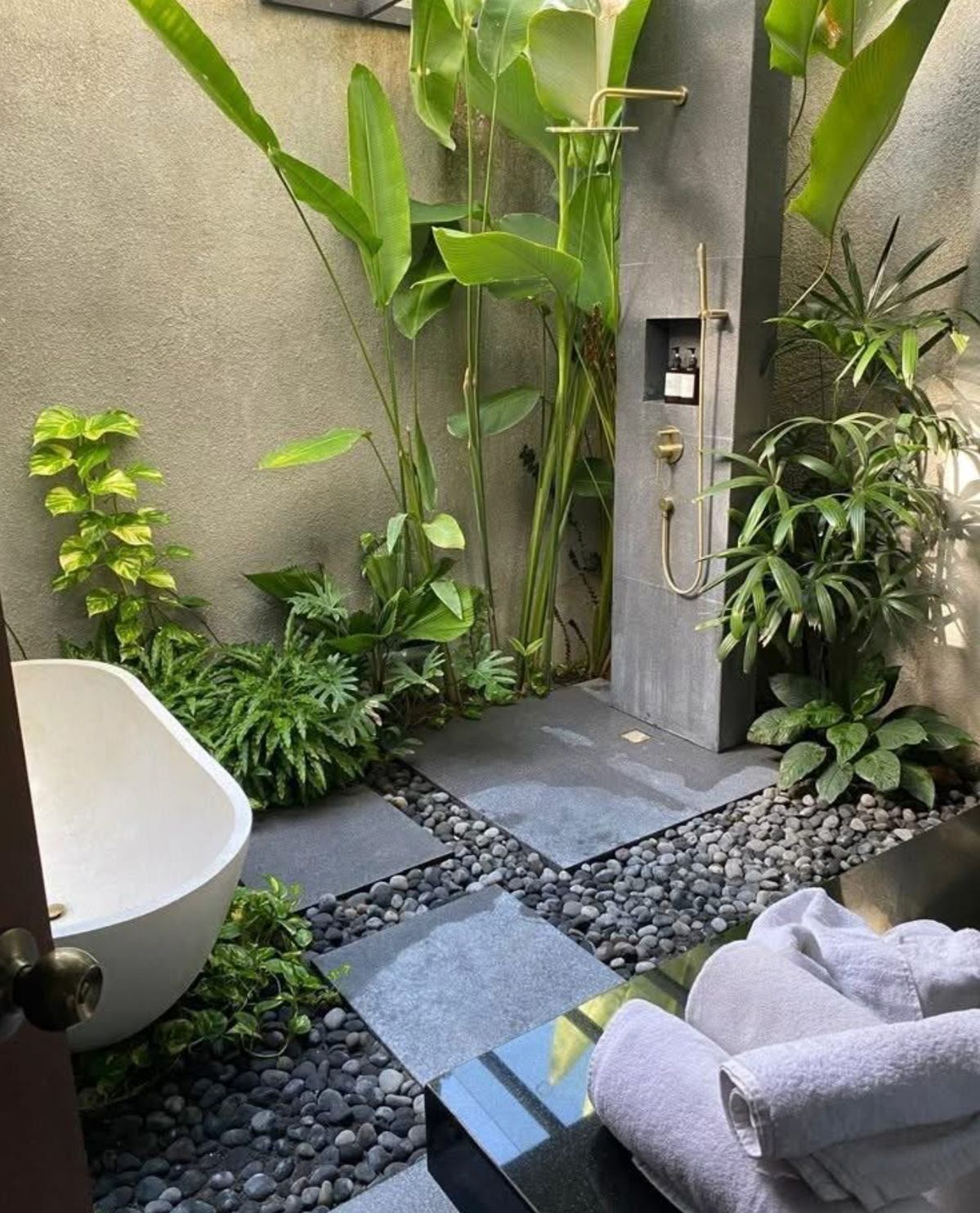 Kevés hangulatosabb dolgot tudunk elképzelni a kertben, mint a kerti zuhanyzó. Egy növényekkel tarkított, természetes kavicsalapú zuhanyrésszel igazi trópusi környezetet teremthetsz!