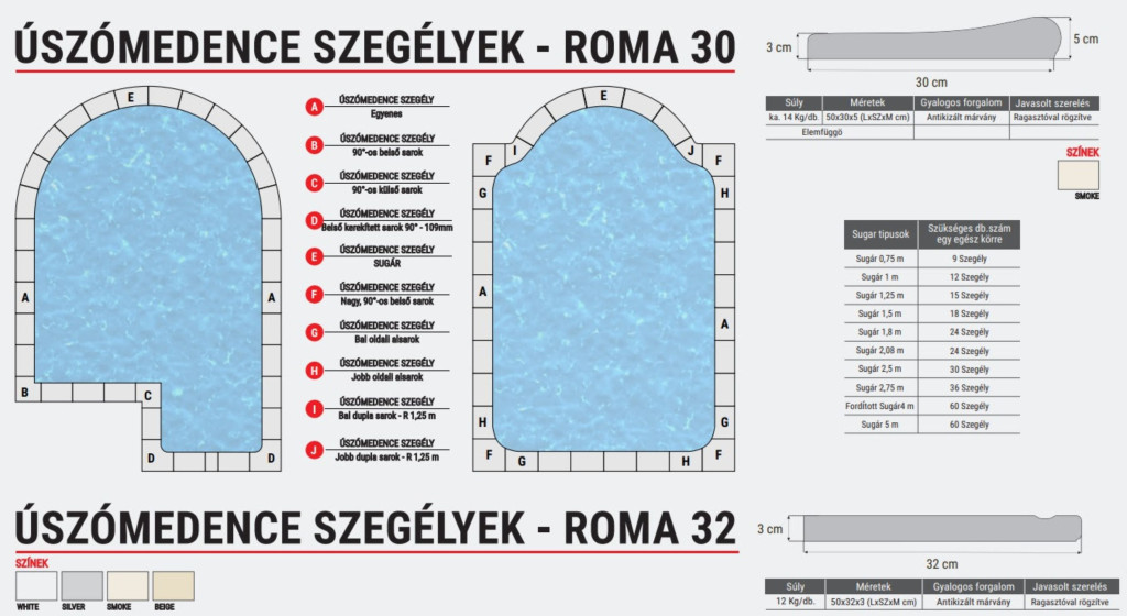 Ez a 90°-os belső kerekített sarok medence szegély elem íves tetejű kialakításával különösen esztétikus és biztonságos megoldást kínál a medence belső sarokpontjain. A lekerekített forma finom átmenetet biztosít a szegélyelemek között, miközben csúszáscsökkentett felülete stabil, balesetmentes közlekedést tesz lehetővé mezítláb is. Strapabíró, fagyálló anyaga ellenáll az időjárási hatásoknak, nem foltosodik, nem mohásodik, így hosszú távon is megőrzi minőségét. A kerekített perem kialakítás segíti a víz irányított elvezetését, miközben kellemes tapintású felületet biztosít. Természetes kőhatású megjelenése nem vakít erős napsütésben sem, harmonikusan illeszkedik a medence burkolatához és a környező kültéri felületekhez.
